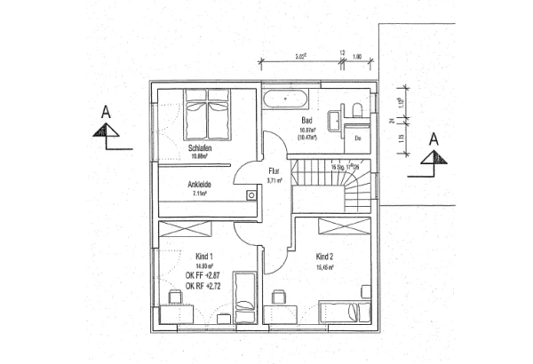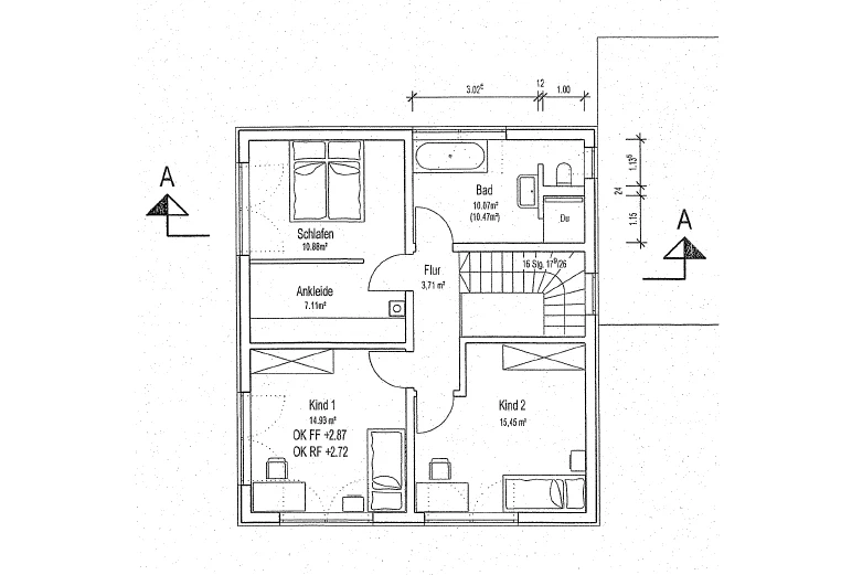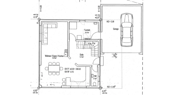 So stand nach 1 Woche der finale Plan für eine Stadtvilla auf zwei Ebenen über 130 m², ohne Keller. Die zwei Vollgeschosse wurden mit einem Walmdach versehen, sodass keine Dachschrägen die Räume verkleinern. Eines der vielen Highlights dieses Eigenheims bei Würzburg ist die moderne Stahltreppe mit Stufen in Eiche keilgezinkt – ein absoluter Blickfang im Eingangsbereich und ein ausdrücklicher Wunsch von Herrn Wirth.