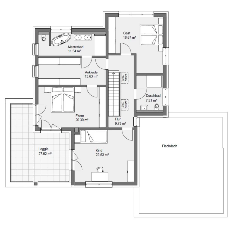 Der Flur im Obergeschoss ist dank zweier Lichtkuppeln im Flachdach tageslichthell. Er erschließt zunächst einen komfortablen Rückzugsbereich mit Ankleide. Von der aus geht es links ins Schlafzimmer und rechts ins private Masterbad. Auch das Gäste- und das Kinderzimmer, die sich ein Duschbad teilen, sind vom Flur aus erreichbar.