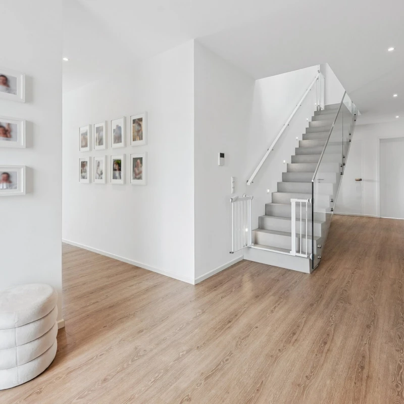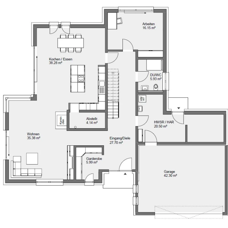 Ein Eyecatcher ist die geradläufige und eindrucksvolle Treppe in Betonoptik. Rechts liegen Gästebad, der Technik und der Hauswirtschaftsraum sowie die Garage. Der Hauswirtschaftsraum, der die Garage mit der Diele verbindet, bietet viele praktische Vorteile für den Alltag.