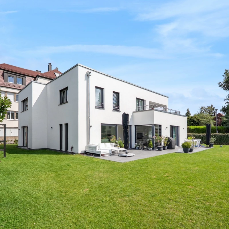 Dieser Bauhaus-Quader liegt nur wenige Minuten von der Würzburger Residenz entfernt. Der Eingangsbereich ist das Gesicht eines jeden Hauses. Eine großzügige, helle Diele strahlt Offenheit und Freundlichkeit aus.